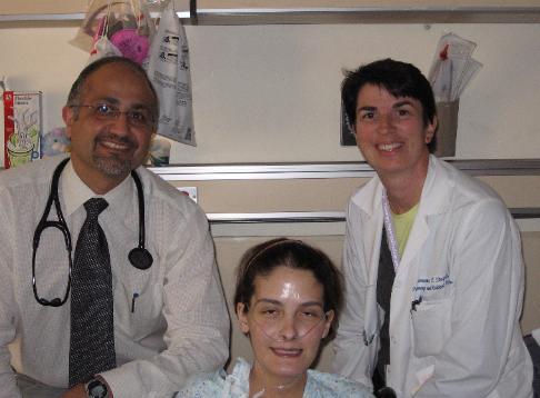 | Meaghan shown in May '07, Post Transplant at Stanford with Romona Doyle, MD, and Rohan Zamanian, MD, Two of Her Favorites |